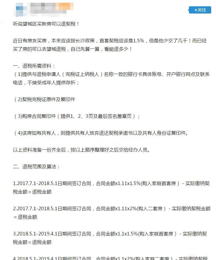 该消息称," 近日有房友买房,本来应该按长沙政策,首套契税应该是 1.5%,但是他少交了几千!而已经买了房的可以去望城退税,自己先算一算,看能退多少!" 并称 2017 年 7 月后在望城买房可退税。