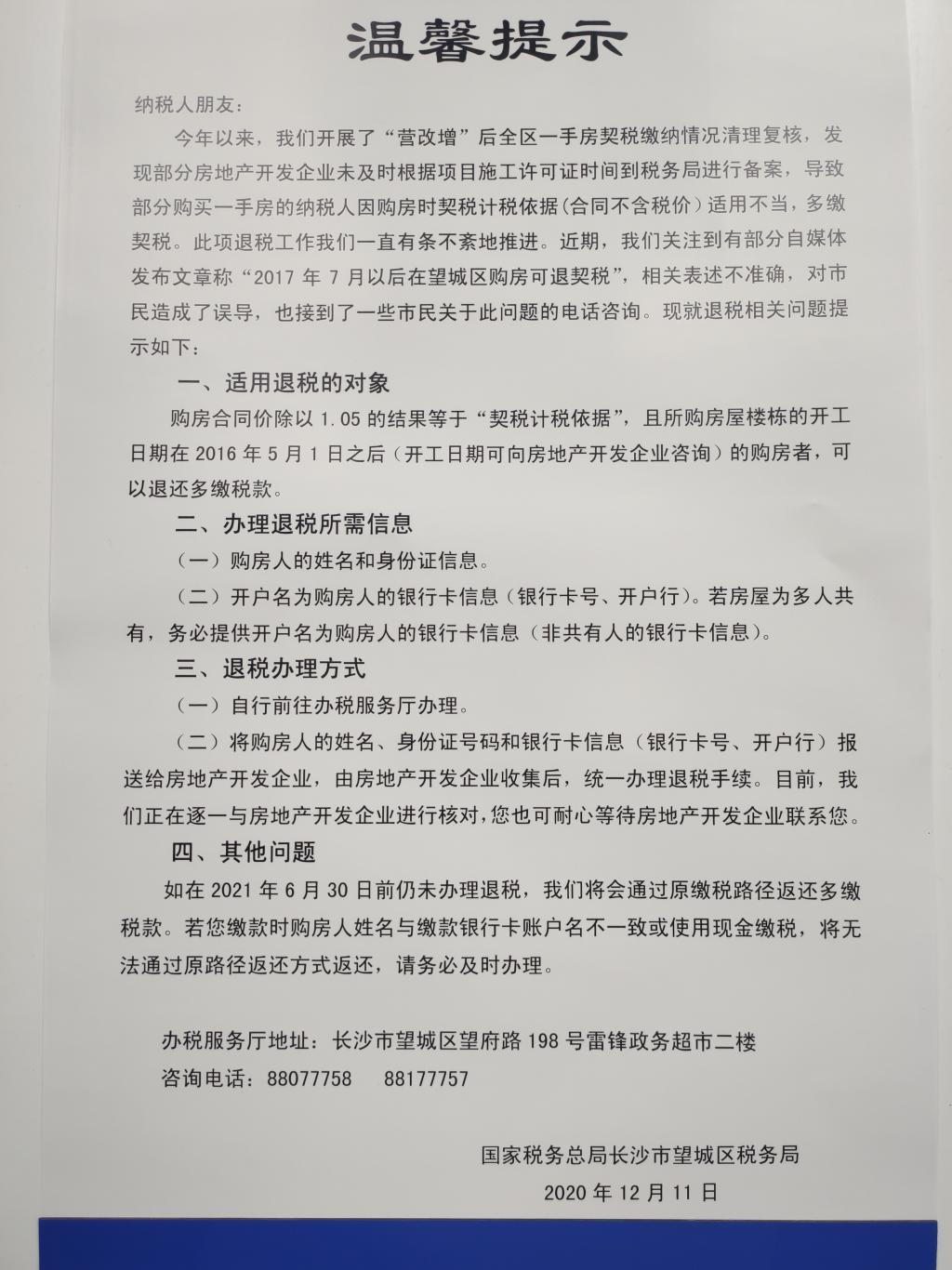 《温馨提示》称,有部分自媒体发文称 "2017 年 7 月后在望城区购房可退税 " 相关表述不正确,对市民造成了误导,也接到了一些市民关于此问题的电话咨询。
