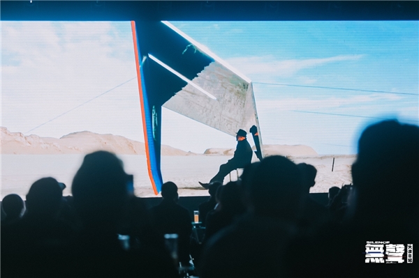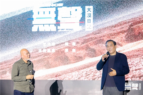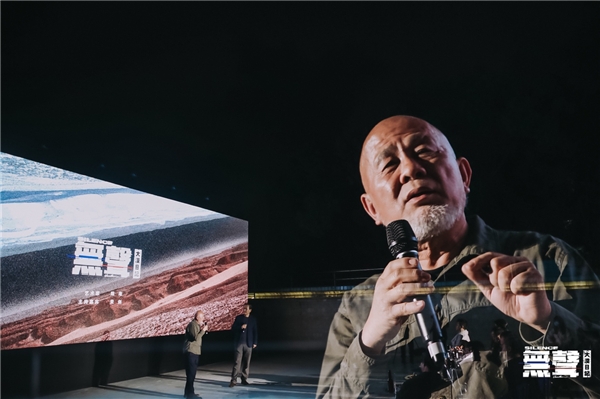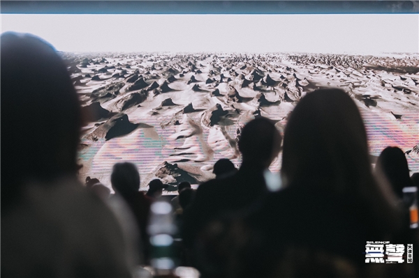 艺术家精心构建的曾存在于无人荒漠中的展厅也被带回到展影现场,重新安置在艺术园中。周边环境的落寞荒败与影像画面的不断变换,让在场众人身临其境,犹如回到了寂静无人的荒漠之中。在展影现场,艺术家陈海与主持嘉宾荣剑先生进行了对谈,关于 0观众/1件作品/ 24小时展期的展览概念,他希望做一次打破常规的展览形式的尝试,摒弃掉展览中繁琐的环节,更加专注于单纯和直白的艺术表达。而对于“無聲”,他认为当我们置身于一个无限辽阔的环境中,会感到“话语”的无力,语言思维的逻辑仿佛被突然抽离,然而通过自然景观的反复观照,会获得一种感性化的空间感受力。不同于城市的钢筋水泥、汽车喇叭、人群喧闹和永不停歇的机械运转,在荒漠中,有的是延绵无尽的寂静和由内而外生发的自我感受。