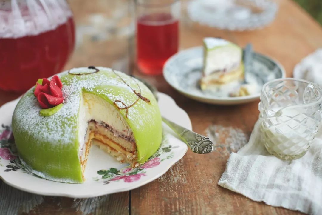 源自瑞典公主嘴馋的甜点,如今成为节日必备美食—— 瑞典公主蛋糕不仅卖相极佳,味道也特别诱人:鲜绿色的杏仁糖衣表皮,裹着厚厚的淡奶油、香草乳蛋糕和夹心果酱,一口咬下去甜到心底。