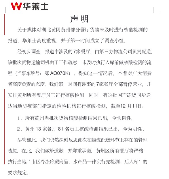 声明还表示,已将涉事的7家餐厅全部暂停营业,并安排黄州所有餐厅员工进行核酸检测。同时,将这批国产冻货进行核酸检测。截至12 月11日,黄州当批次货物核酸核酸检测结果均为阴性,黄州13家华莱士餐厅的81名员工核酸检测也均为阴性。