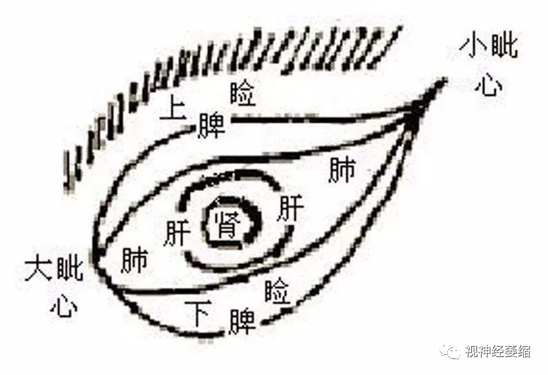 早在《黄帝内经》就有专论:“五脏六腑之精气,皆上注于目而为之精,精之窠为眼,骨之精为瞳子,筋之精为黑眼,血之精为络,气之精为白眼,肌肉之精为约束”。意为:五脏六腑的精华物质,均为向上濡养眼睛,而使其能精明视物。脏腑精华所聚之眼,其中,肾精(肾主骨,故为“骨之精”)充养瞳孔,肝精(肝主筋,故为“筋之精”)充养黑眼,心精(心主血,故为“血之精”)充养内外眦血络,肺精(肺主气,故为“气之精”)充养白眼,脾精(脾主肌肉,故为“肌肉之精”)充养约束(眼睑)。