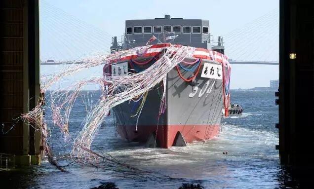 图注:日本海上自卫队新一代扫雷舰“淡路”号下水仪式 日本海上自卫队近年来新装备的新一代“淡路”级远洋扫雷舰,虽然它个头不大,只有690吨,却因为造价高昂,每吨排水量的单位造价几乎等同于黄金价格,因此被称为“黄金舰艇”。