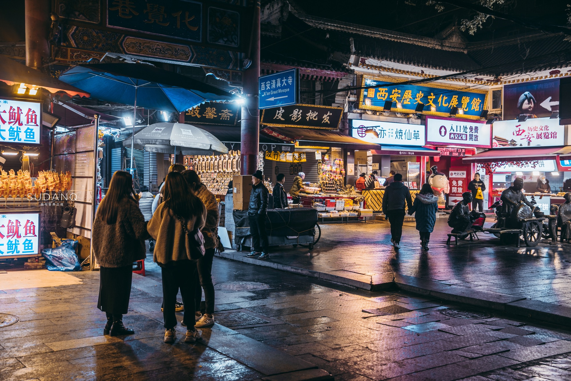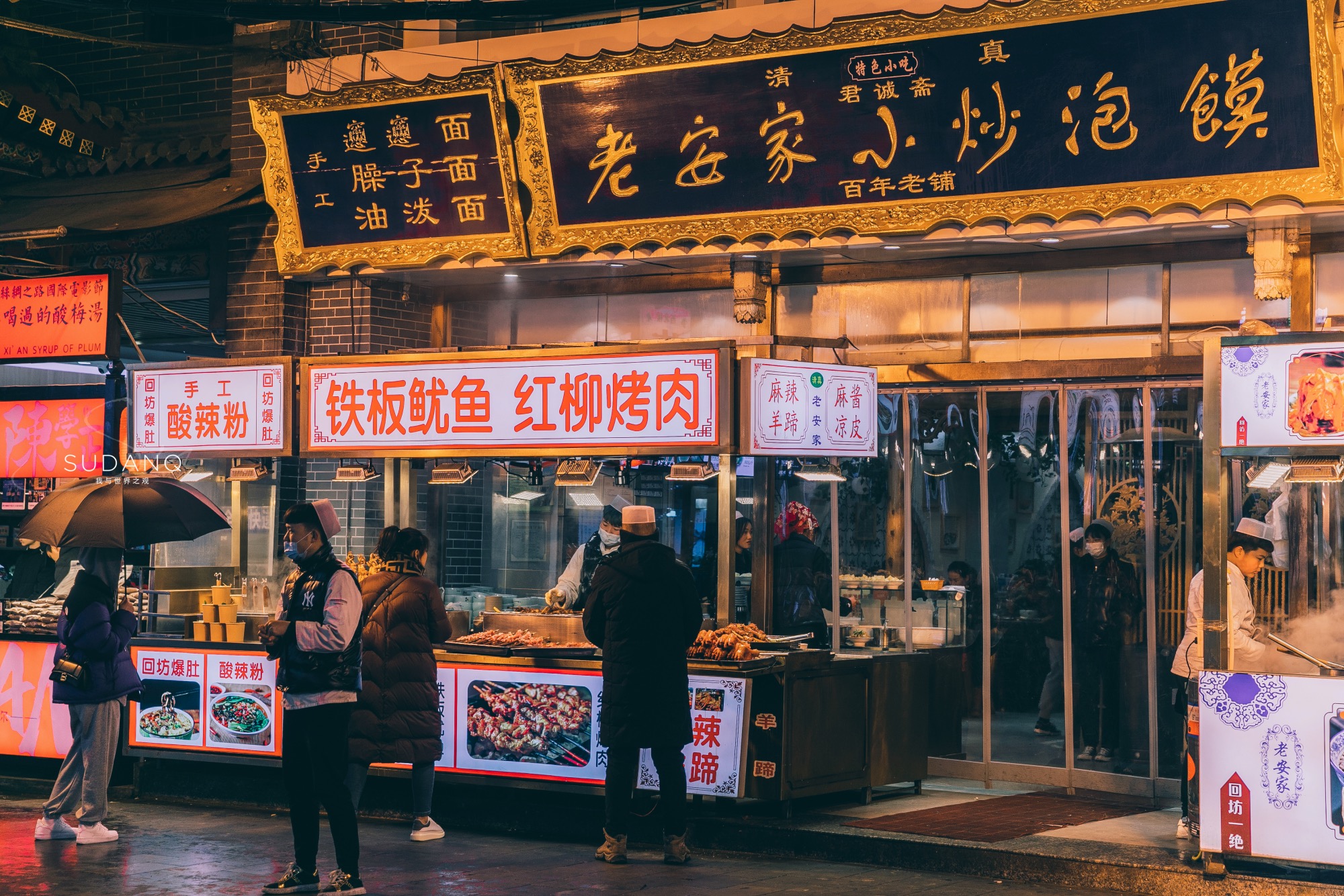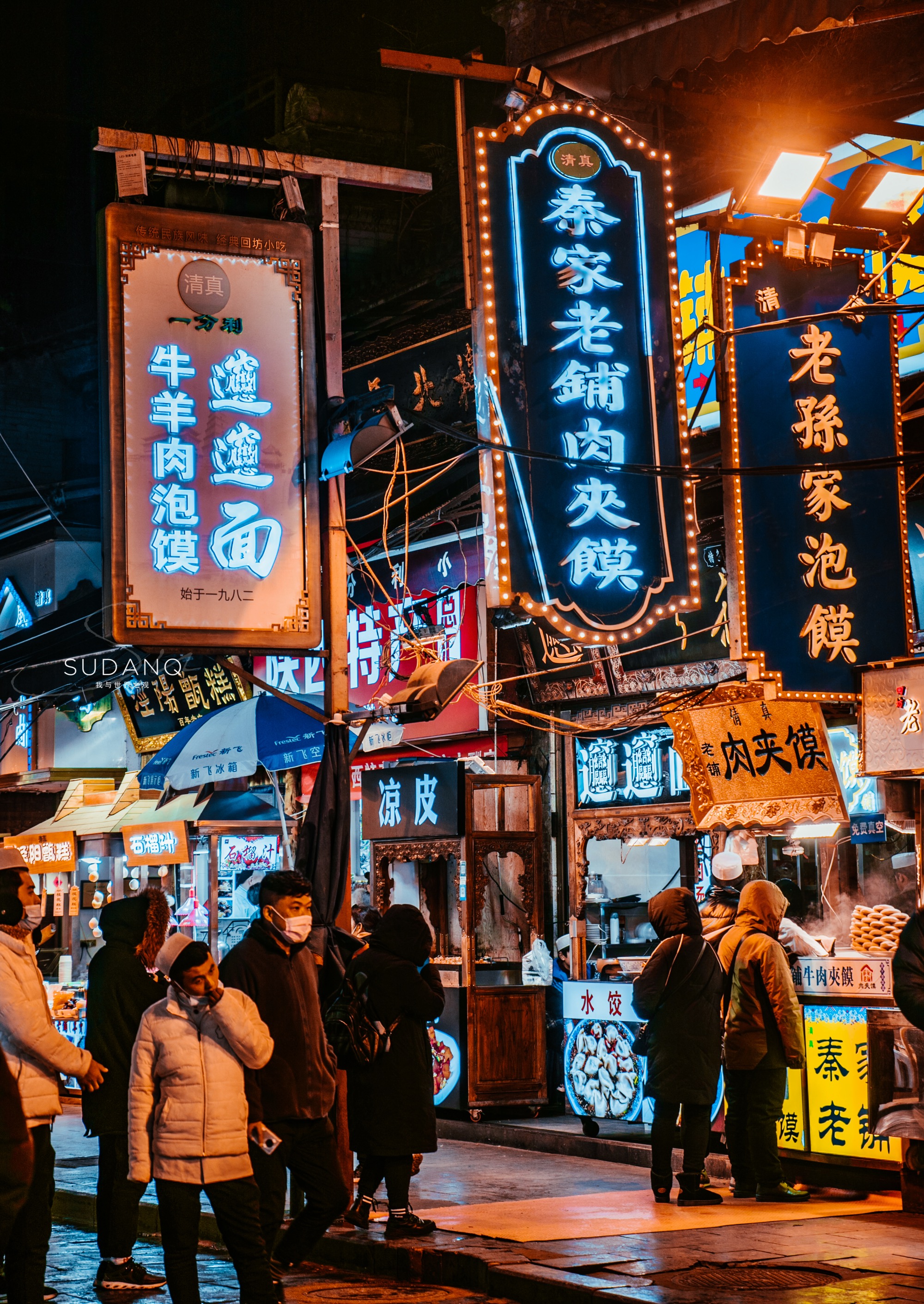 置身其间,钟鼓楼的华美灯色与摊贩们的电灯交相辉映,游人的交谈声与店家叫卖声、食物的沸腾声揉成一片,悠长的巷道,几百种小吃,穿梭其中,任是摩肩接踵也是一种乐趣。