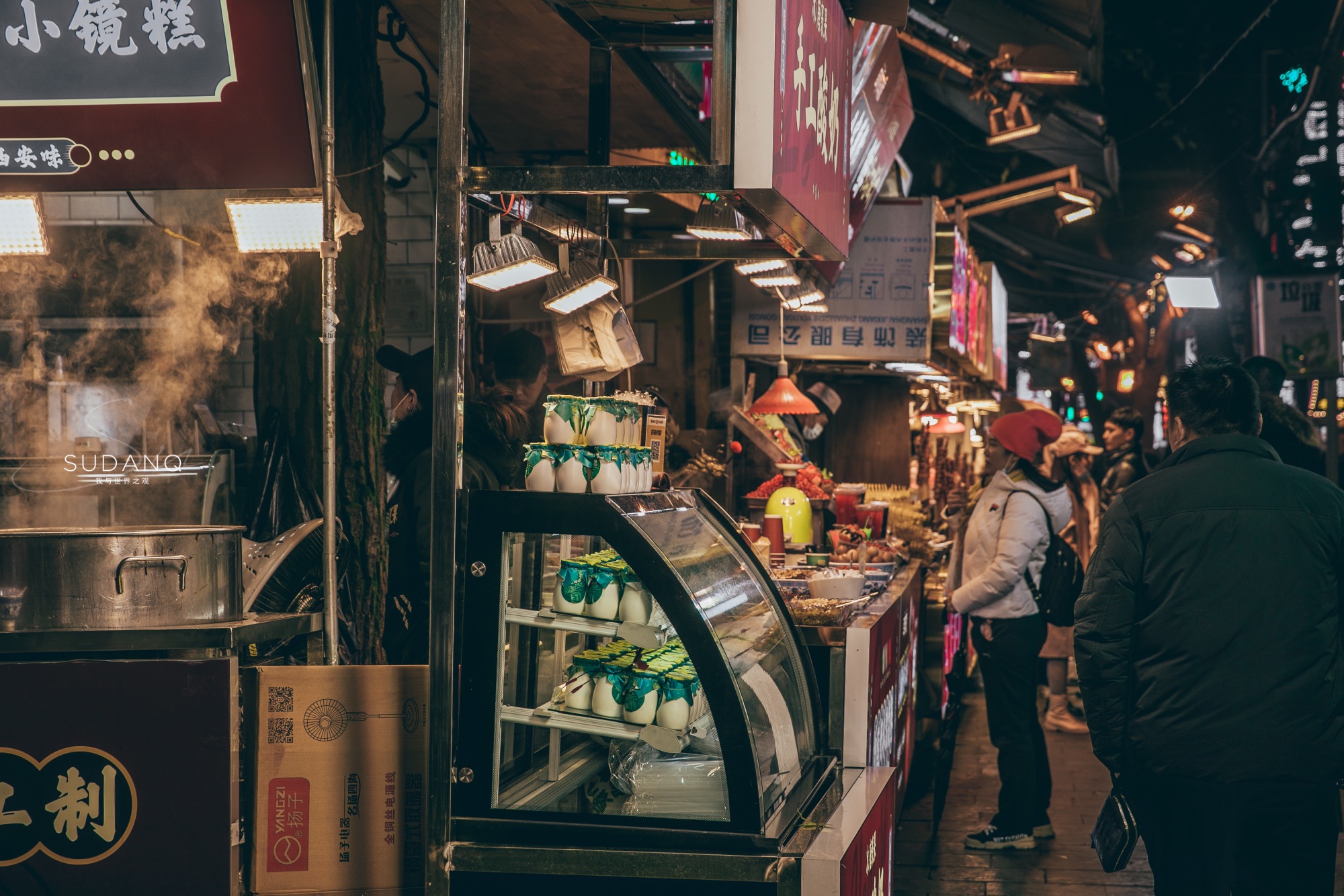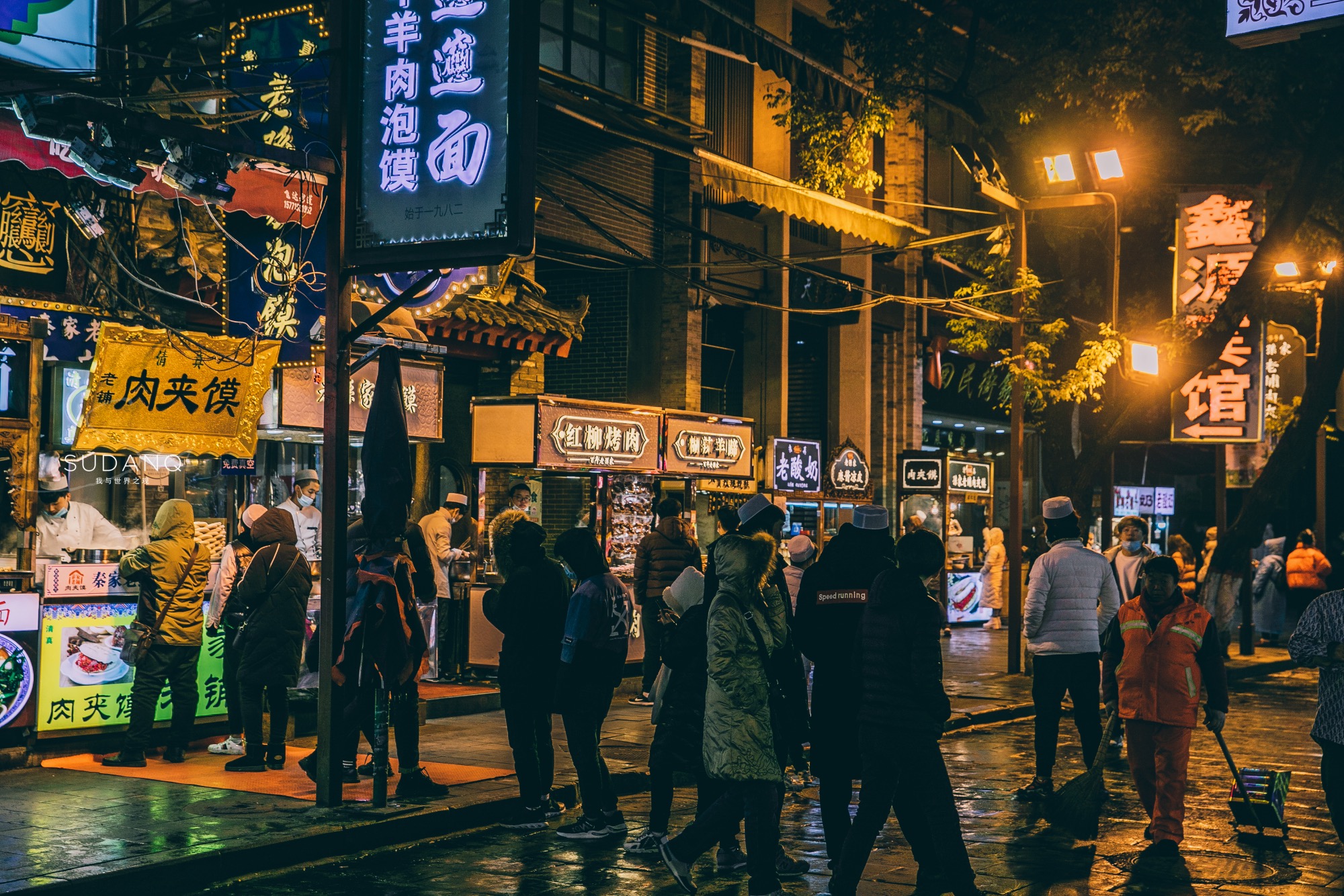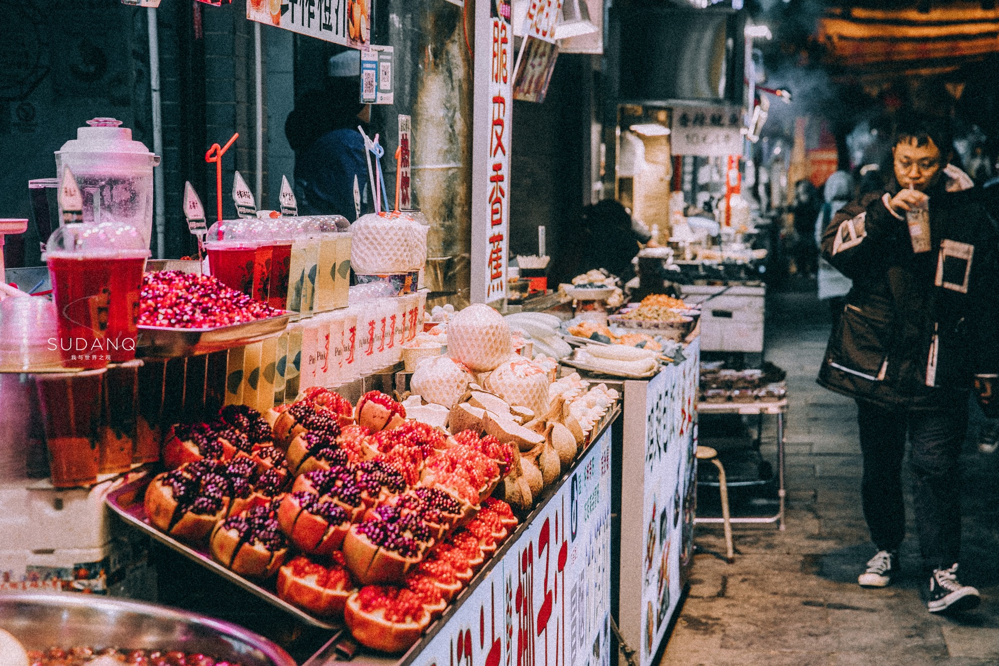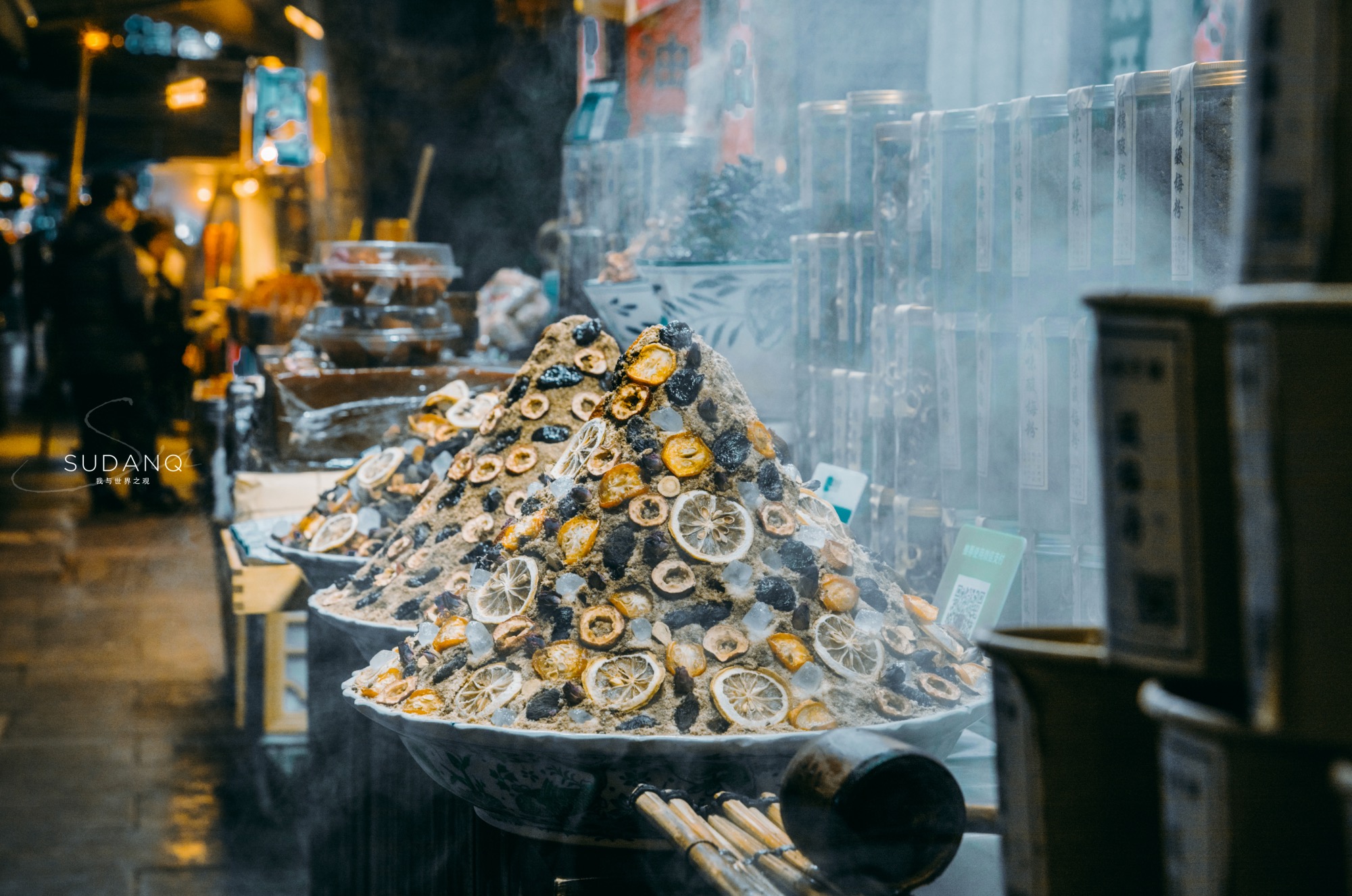 置身其间,钟鼓楼的华美灯色与摊贩们的电灯交相辉映,游人的交谈声与店家叫卖声、食物的沸腾声揉成一片,悠长的巷道,几百种小吃,穿梭其中,任是摩肩接踵也是一种乐趣。