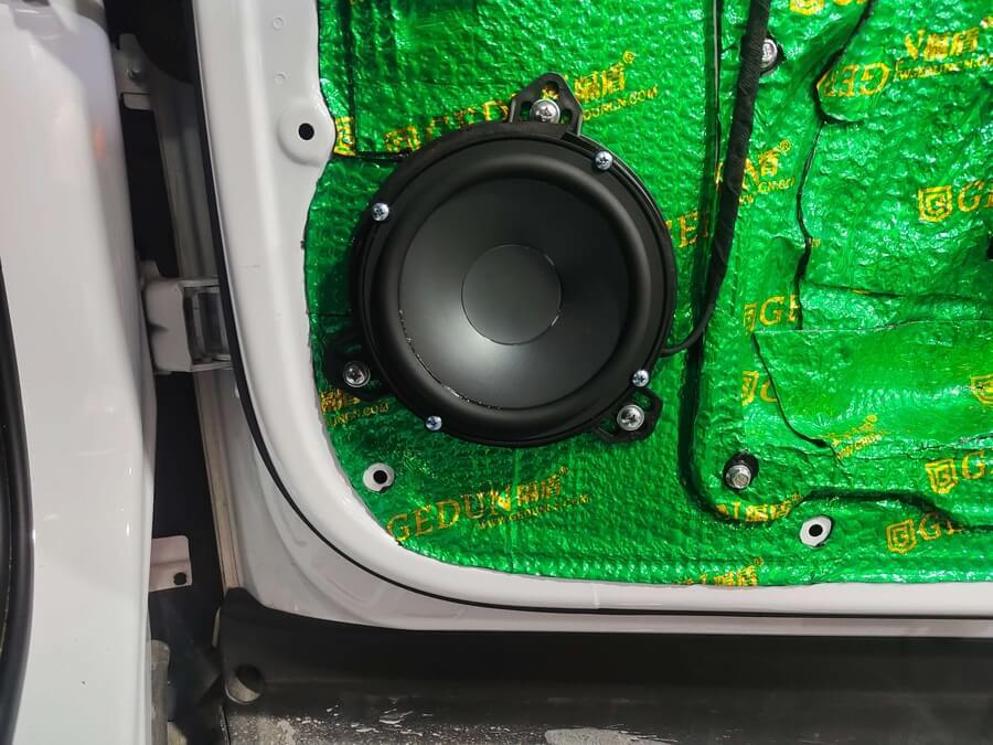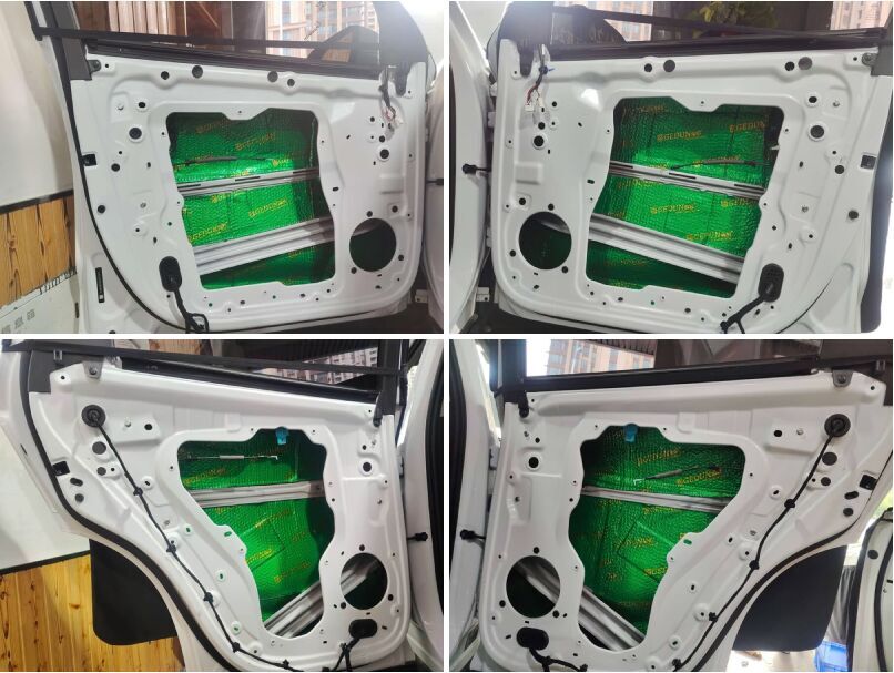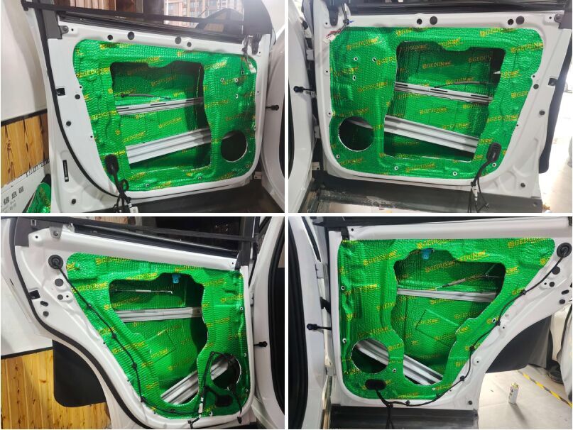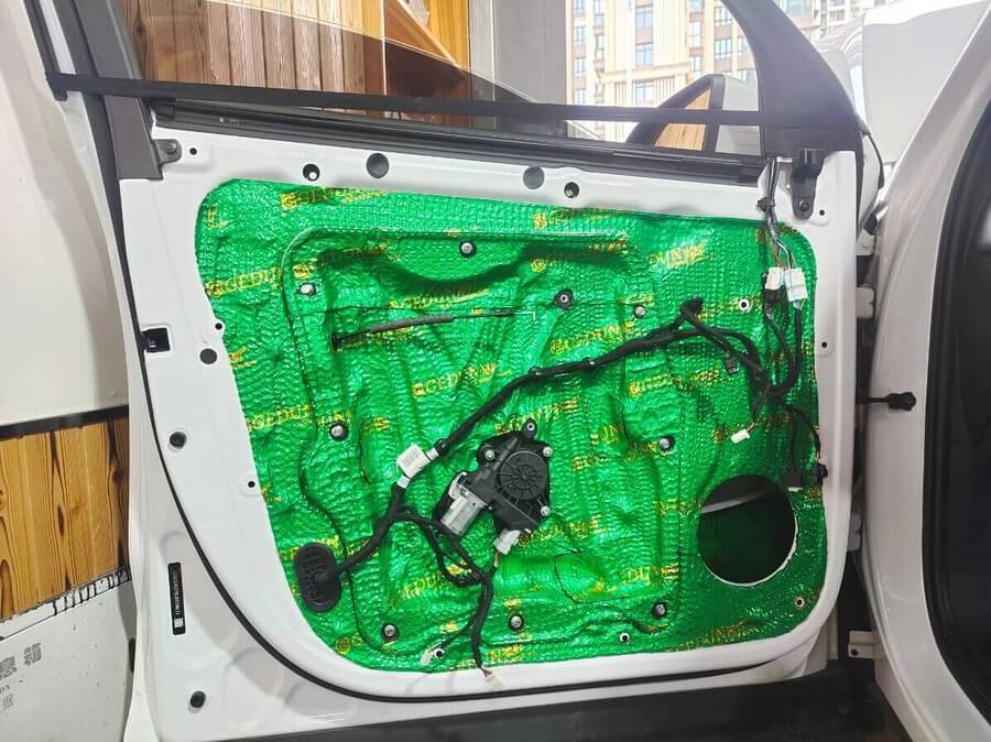 先将车门拆开清理干净,然后使用隔盾隔音材料对车门进行双层隔音处理,里层隔音主要是加强门板厚度,减少车门共振以及风噪入侵。外层隔音则是将车门密封起来,有利于提升音响效果。