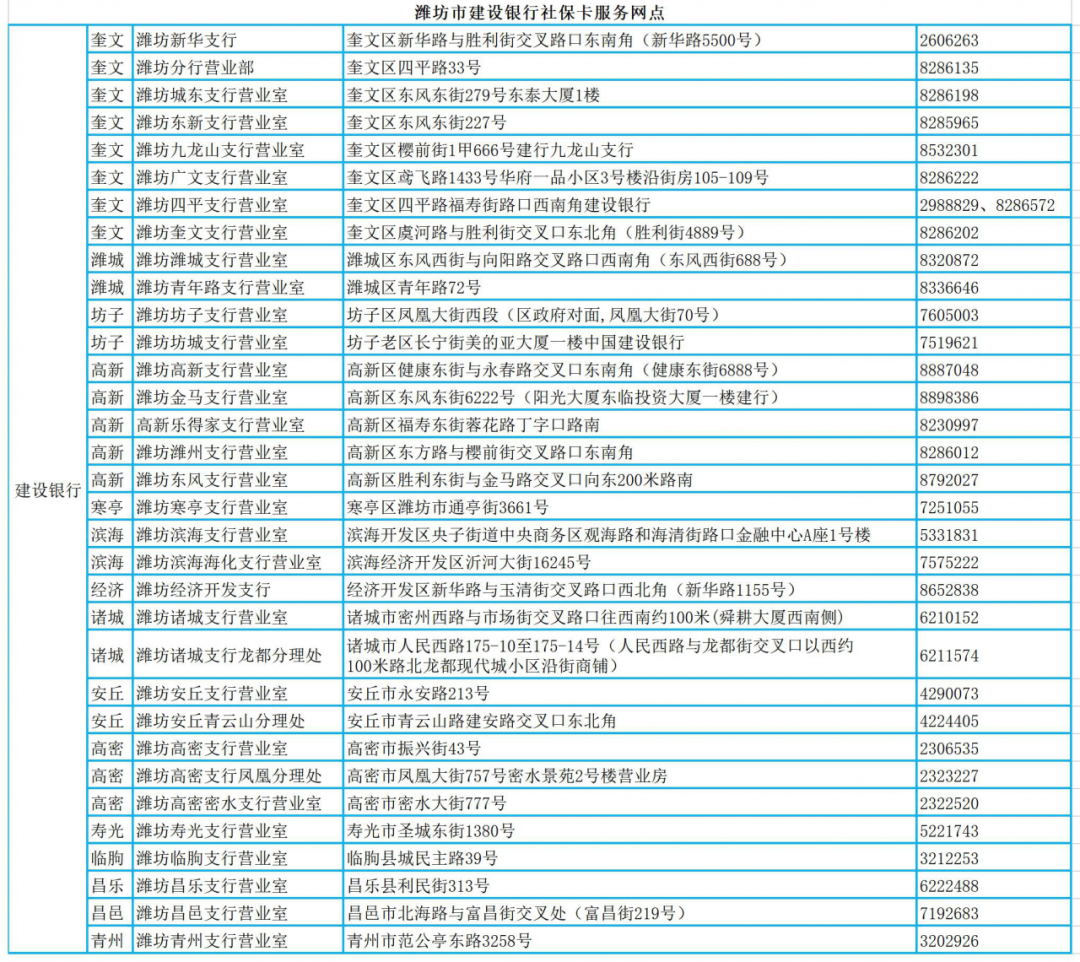 为方便群众能够就近办理社保卡业务,近日,市人社局联合建设银行新增布设了14家社保卡银行综合服务网点,新增后全市共33家建设银行网点支持办理即时制卡业务,其中奎文区8家、潍城区2家、坊子区2家、高新区5家、寒亭区1家、滨海区2家、经济区1家,城区网点已实现全覆盖。诸城市2家、安丘市2家、高密市3家,其他县市均为1家,做到了社保卡申领、补换“就近办、即时办”。