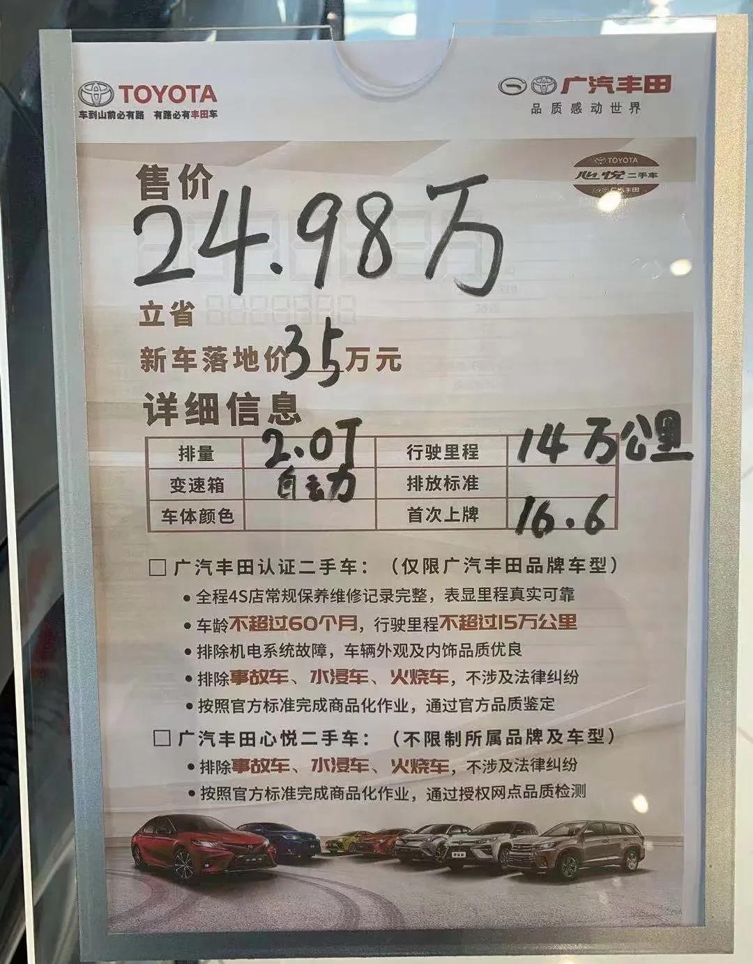 这不,近日某广汽丰田经销商内出现一台跑了14万公里的汉兰达二手车,当时新车落地价35万,如今二手销售近25万。为什么一台二手的汉兰达会挂出如此高的价格,这也让很多网友感到难以理解。