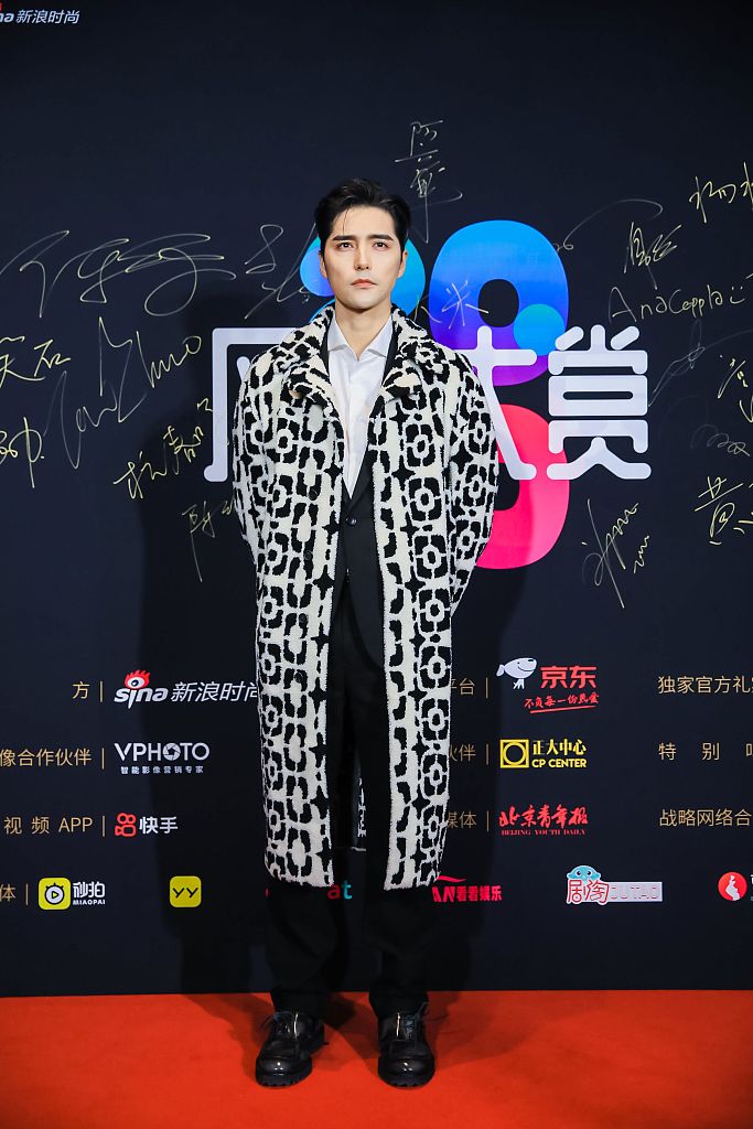 2020年12月14日,北京,红毯,2020新浪时尚风格大赏举行。阿云嘎穿黑白大衣复古潮范儿十足。