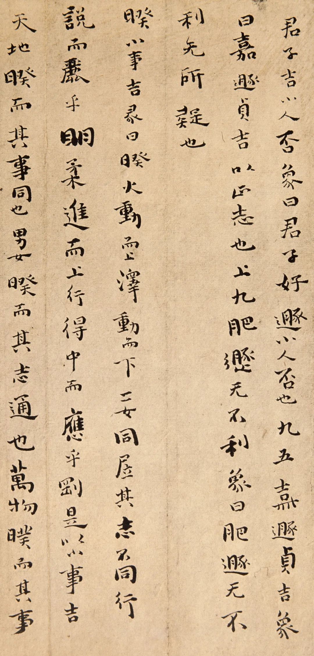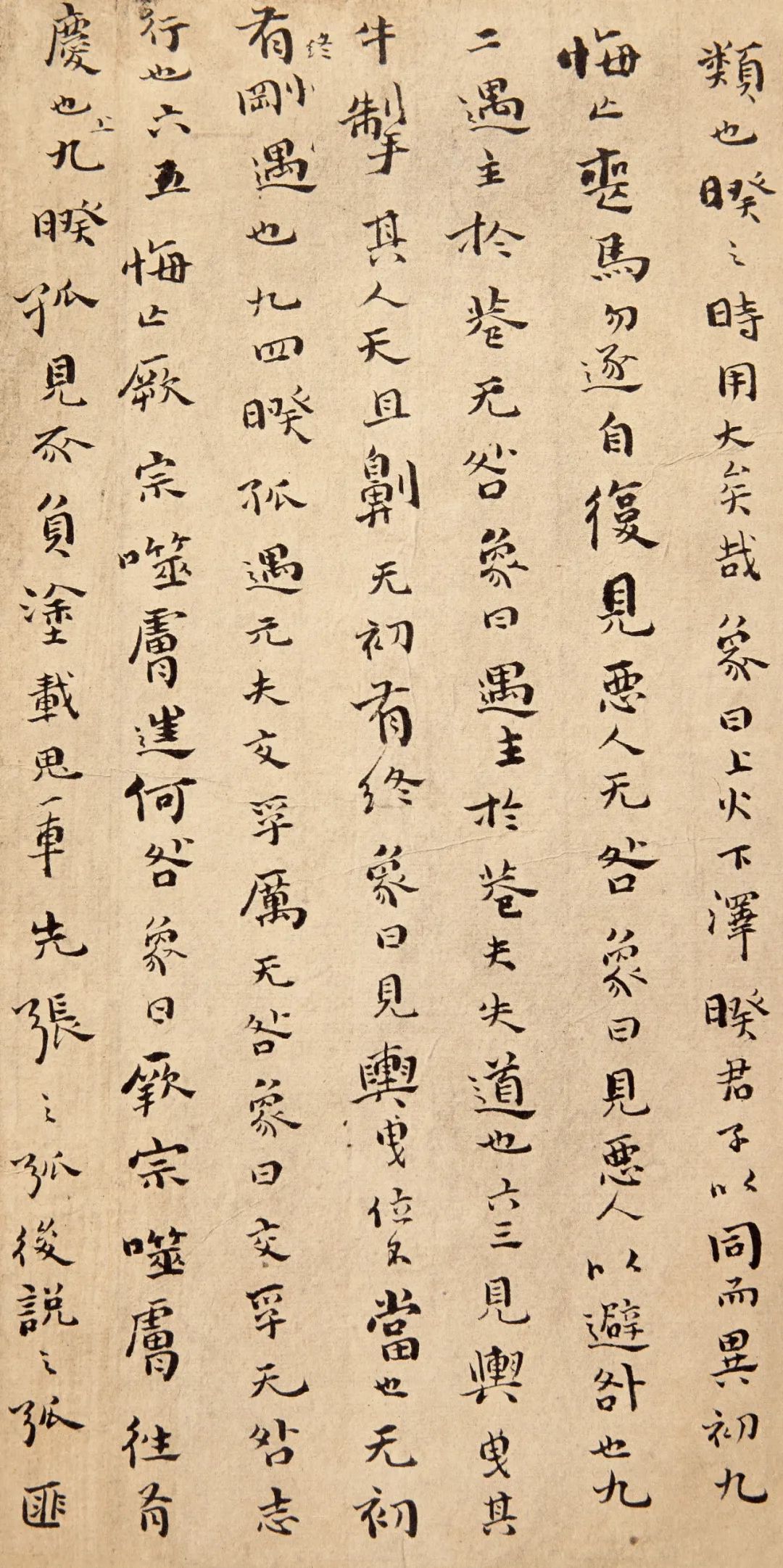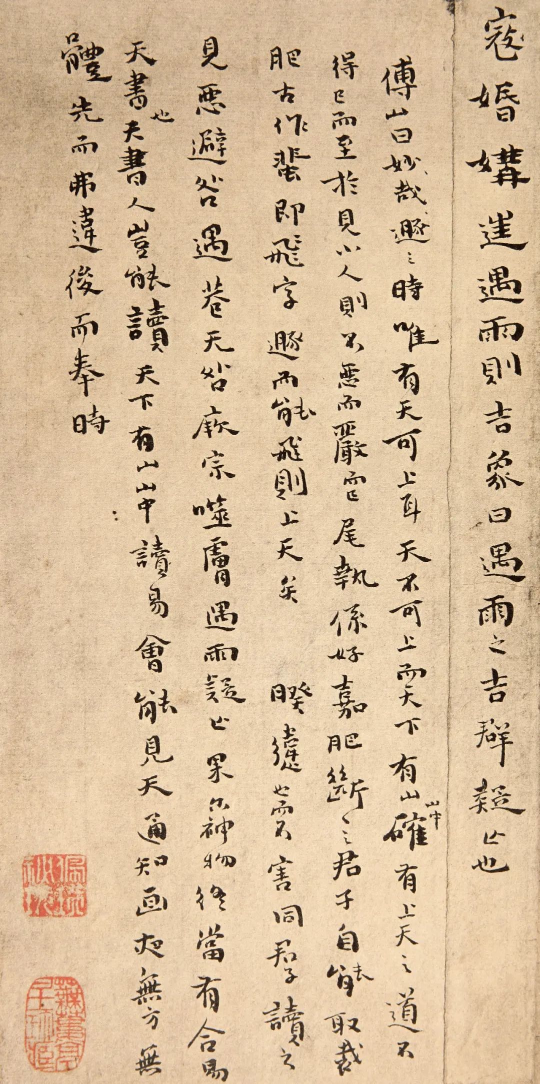 他从八九岁开始先临钟繇(元常)字,然后是王羲之、王献之和颜真卿等诸体。二十岁时已“于先世所传晋唐楷书无所不临”。其间“偶得赵子昂香光诗墨迹,爱其圆转流丽,遂临之,不数过而遂欲乱真”。 此时的傅山,因长期接受传统儒学教育,三纲五常、四维八德是他的价值观、人生观和行为准则 。尽管经历了袁继咸蒙冤入狱事件,但踏踏实实地忠心于明朝廷、忠于明皇帝是仍是他的人生理想。“元年戊辰降,十七丁甲申。苦楚四十年,矢死崇祯人”正是他真情实感的表白流露。 学书也是循规蹈矩,一板一眼,体现在楷书作品中则是讲究流丽整洁、典正优雅,一派中和典雅的气象 。如《小楷行书诗词》《临王羲之东方朔画赞》等。
