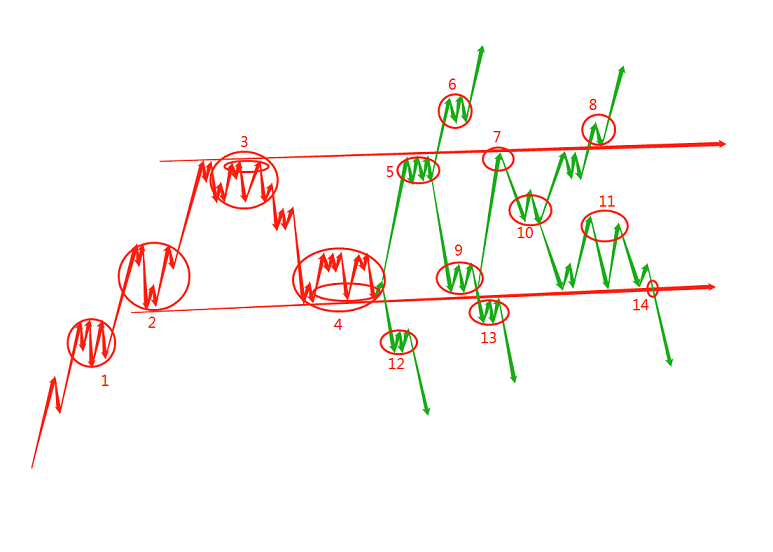 位置14处含义为整体大形态向下变盘,此位置遵循区间内的高空低多原则后,多单会被扫损,造成高空低多失效。所以临近变盘末期,尤其形态振幅收窄后,做单要轻仓并严格设止损。