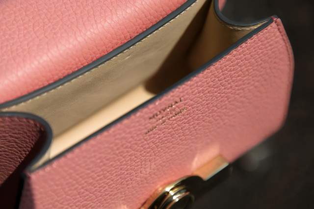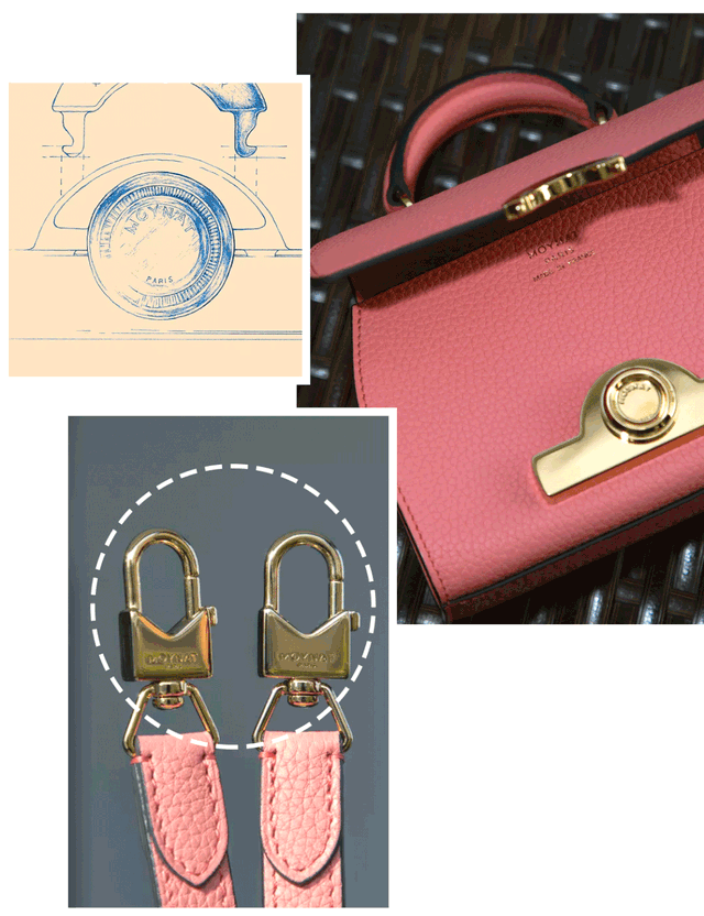 再就是五金,我个人蛮喜欢包包上面的专利锁扣,非常秀气内敛,设计原型来自早年间法国戏剧院中的装置艺术,轻轻向下按压圆形锁扣就可以打开了,用起来既方便又很有安全感。我还发现肩带接口处的五金还是个小小的M字型,真心为这个细节点赞。