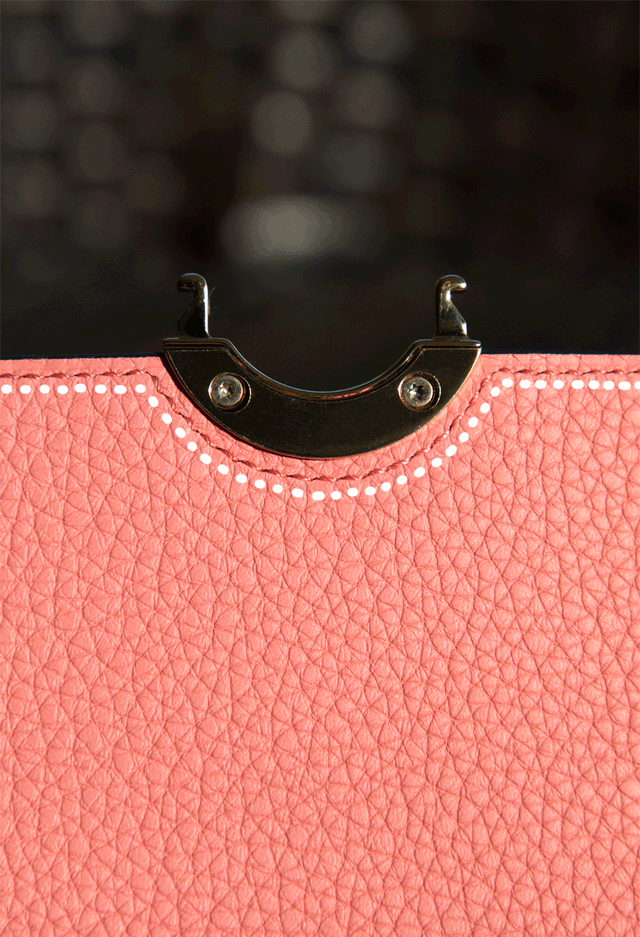 像我入手的这一款,采用他家经典Taurillon Blush粒面小牛皮,纹理分明,每块斑纹大小均匀甚至还对称,低调有质感又好打理。