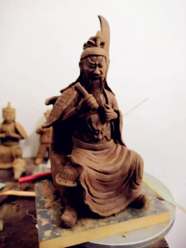 一块普普通通的泥团,通过几把简易的工具,经过胡超的巧手塑造,转眼间,一个惟妙惟肖的关公泥塑形象便诞生了。