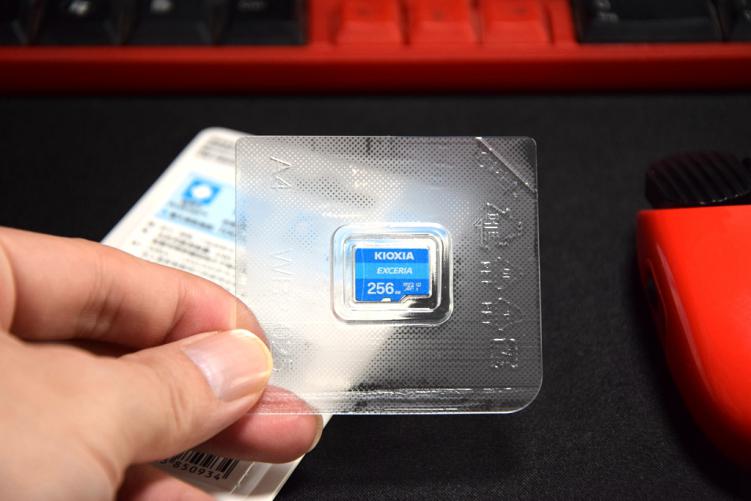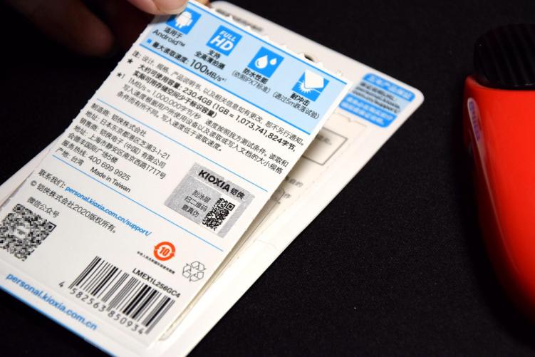 包装上,铠侠(Kioxia)EXCERIA™极至瞬速™micro SD 存储卡使用了一次性纸质卡封,通过背面齿状小条能轻易地将外包装打开。