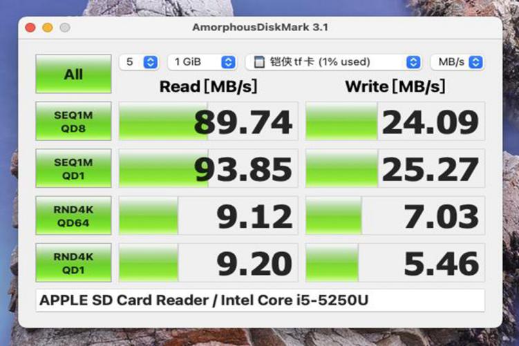 通过测试,可以看到铠侠(Kioxia)EXCERIA™极至瞬速™micro SD 存储卡在两款软件中基本保持着90MB/s的稳定值,虽然达不到官方给出的100MB/s,但这个性能在众品牌中可谓名列前茅,至少以往入手的micro SD存储卡都给不出这样的成绩。