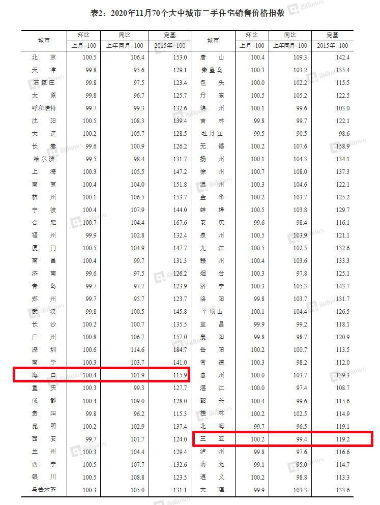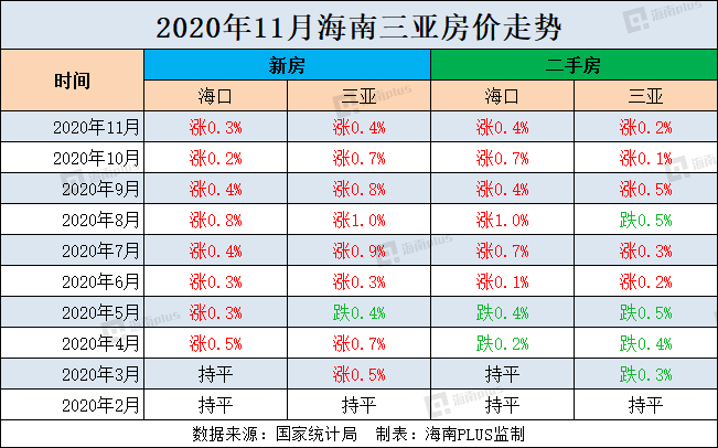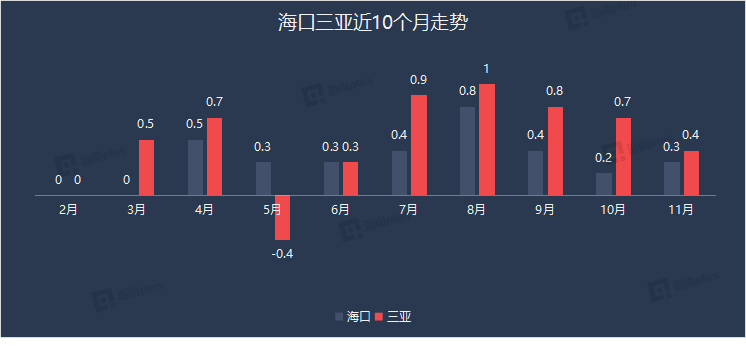 12月14日,国家统计局公布11月份全国70城房价走势住宅销售价格变动情况。11月份海口新建商品住宅价环比上涨0.3%,二手住宅价环比上涨0.4%;三亚新建商品住宅价环比上涨0.4%,二手住宅价环比上涨0.2%。