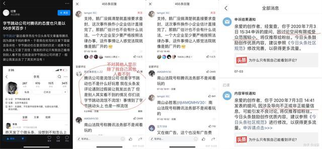 值得注意的是,知乎一篇名为《字节跳动公司对腾讯的态度也只是以50步笑百步!》的文章中,作者称其在今日头条李亮文章下留言,回忆字节跳动"耍流氓"的历史,不曾想却被今日头条耍了流氓,评论淹没在一众紧随李亮声讨腾讯的"水军帖"里,本该全体可见的评论竟只是"仅作者本人可见"。当作者在头条系旗下悟空提问平台追问缘由时,字节跳动先以"提问违规"为理由回应,后又以"讨论空间有限或受众范围较小"为由搪塞,该作者无奈怒骂"欲加之罪何患无词"。