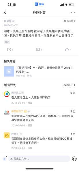 也有脉脉网友表示,其在李亮评论自家起诉腾讯的新闻,打抱不平的头条号下评论称"总裁格局真低",便遭到了头条系的"封口",该帖很快引来他人共鸣,吐槽在别家App探讨了一句张一鸣的格局问题,返回今日头条App便被封了号。