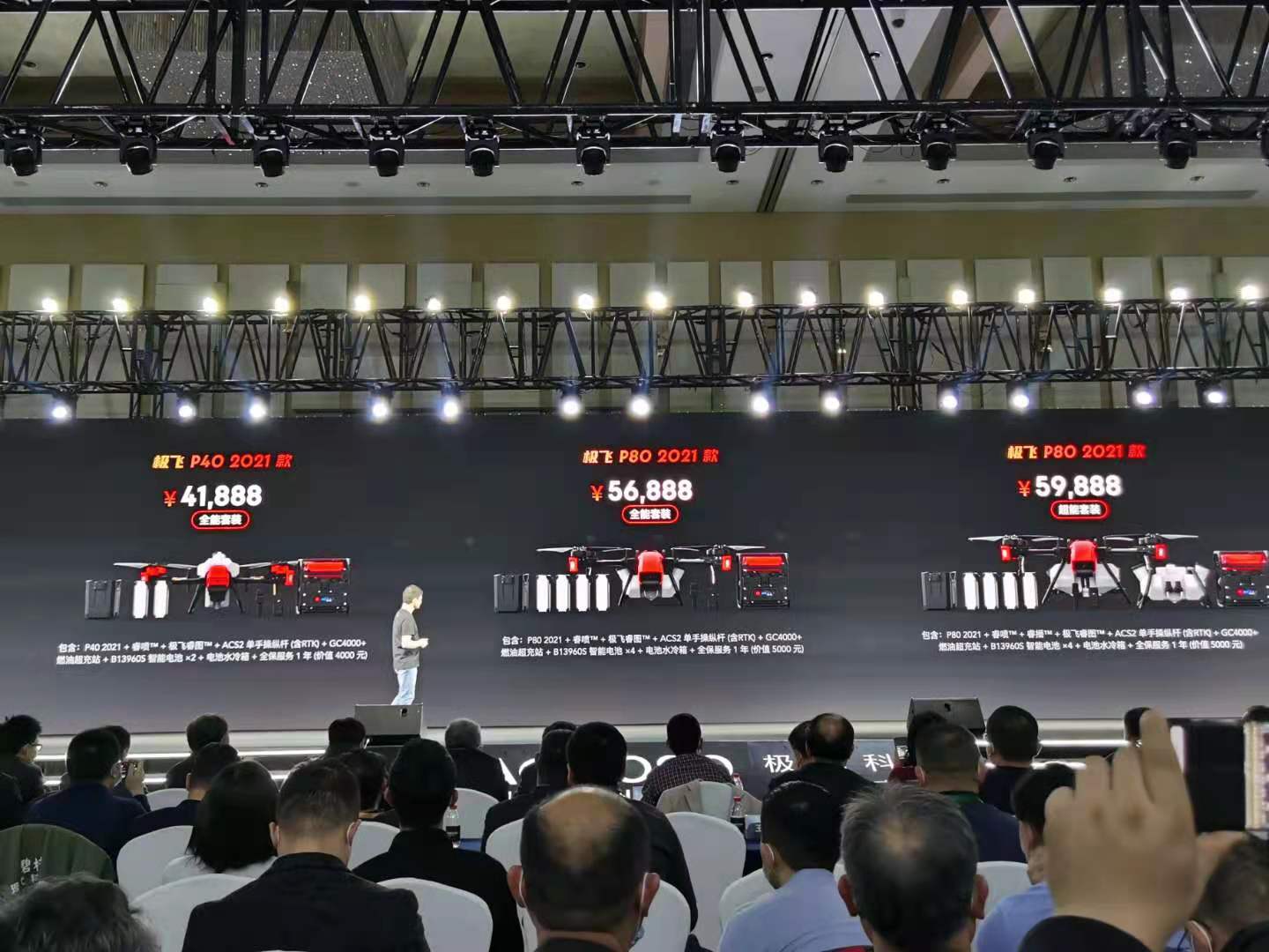 极飞P40 2021款的全能套售价41888元人民币,P80 2021款全能套售价56888元,超能套装(包含睿播播撒系统)售价59888元。