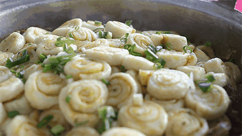 上面蒸着花卷,下面烧着羊肉汤锅。蒸熟后的花卷有了羊肉的香气,吃起来特别鲜美好吃,再配合上无敌的葱花,真的是完美的碳水了。