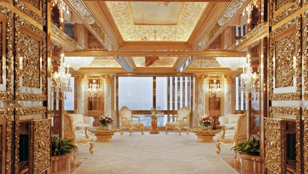 川普位于trump大楼的豪宅,几乎带着扑面而来的富贵气息,咄咄逼人的华贵与张扬,装饰在整套房子任何角落里的黄金,与天价的古董家具,像一座法国路易十四时期的奢华皇宫。