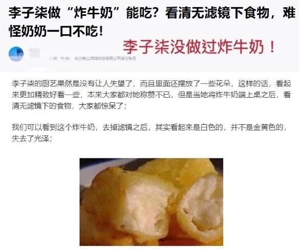 也有营销号以“李子柒做炸牛奶能吃?看清无滤镜下食物,难怪奶奶一口不吃!”为题,用网络图片捏造李子柒没有在镜头前做过的食物—“炸牛奶”卖相令人毫无食欲,以“佐证”李子柒是演员、厨艺欠佳等。