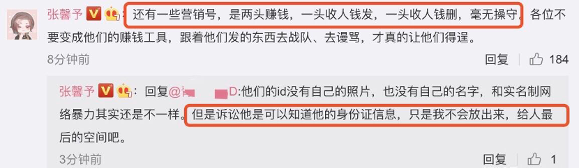 2020年9月,艺人张馨予发微博称某营销号先是刊发了关于她的恶意内容,再发私信至其工作室,索要删帖费用300元。张馨予工作室在向对方提出删除相关恶意内容不果后,决定提告。张馨予后再发博揭露,现在部分营销号媒体的套路是两头赚钱,一头收人钱发黑稿,另一头收人钱删稿,毫无职业操守可言。