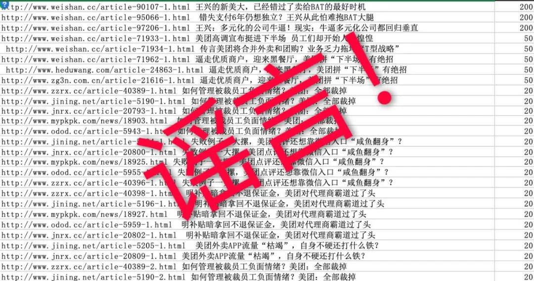 幕后黑手以“逼走优质商户,迎来黑餐厅,美团拼“下半场”有绝招”、“如何管理被裁员工负面情绪?美团:全部裁掉”等为题,对美团进行商业端恶意抹黑。尽管美团多番澄清,但时至今日,相关报道仍能在网络上被轻易搜索到。