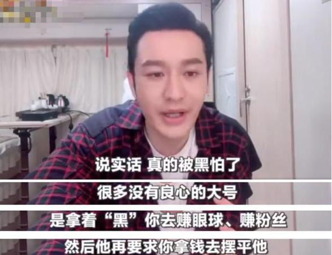 前不久,演员黄晓明在接受采访时,也自称被“黑怕了”,并表示行业内的一些"没有良心"的大V通过发布关于他的不实报道来讹诈钱财。这些所谓大V用无中生有的“黑料”赚取流量,赢得粉丝关注,再要求明星花钱“摆平”。黄晓明称如今他将不再纵容这些勒索,称“越是惯着,他们只会越加放肆”,并呼吁大众不要盲目跟风。