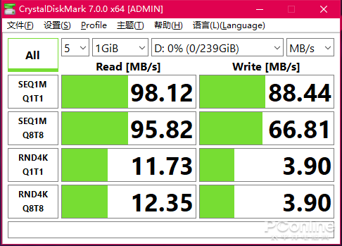 首先是Crystal Disk Mark测试,在1G文件的测试中,这款存储卡的写入速度为88.44MB/s,读取速度为98.12MB/s,符合官方标称的读100MB/s,写90MB/s。