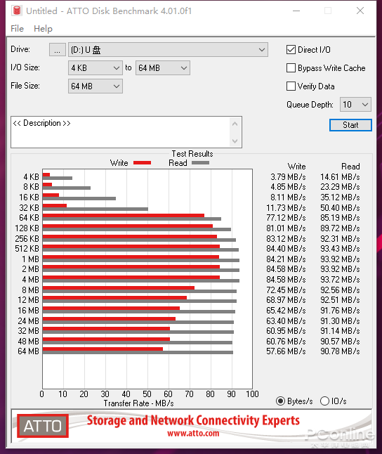 在ATTO Disk Benchmark测试中,可以根据不同大小的数据包来检验这两张内存卡在不同文件大小下的读写性能。三星PRO Plus 256G版本最高写入速度达到93.92MB/s,最大读取速度为84.58MB/s,基本达到了官方的数据(官方测试以1mb=1000kb进行换算)。