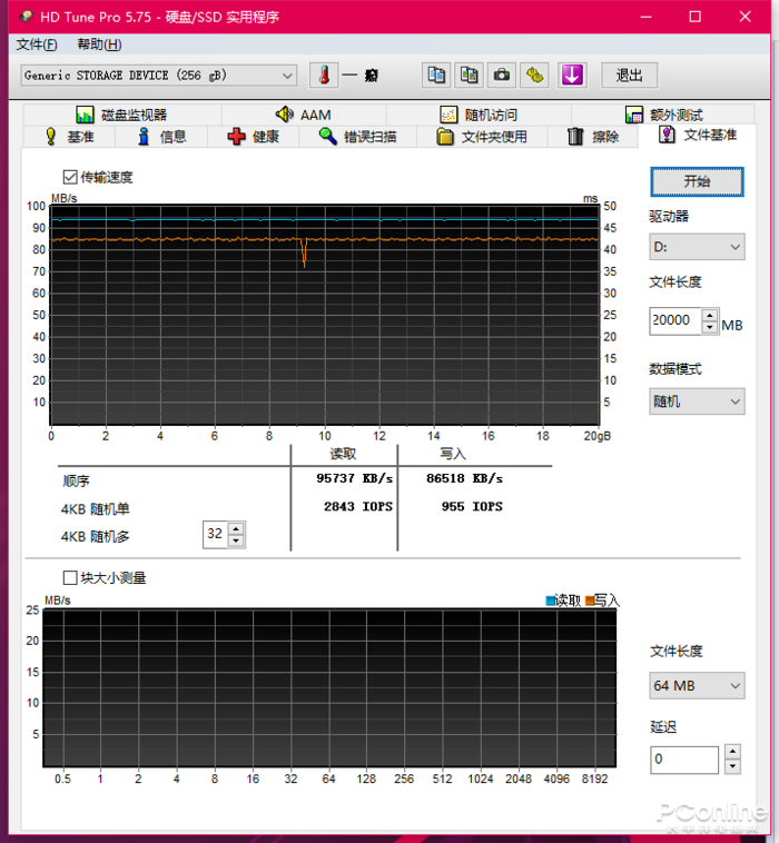 然后在HD Tune Pro下的文件基准测试,该模式下分别通过真实写入文件后再读取文件的方式进行测试,能很好地模拟存储卡的实际工作状态和真实传输速度。 这张存储卡的定位是主打高性能,为了测试这张存储卡在长时间连续读写场景使用下有何表现,我们设定了20G的文件长度进行测试,传输速度一直稳定在86MB/s左右,整体表现非常稳定。