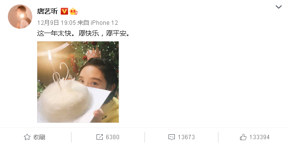 12月9日,唐艺昕在微博上晒出了自己手捧蛋糕,庆祝生日的照片,配文: