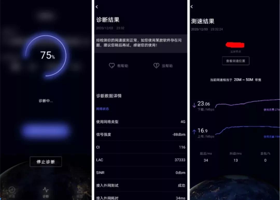 目前华为云测节点已经超过3000个,覆盖了所有城市,是测速准确的关键保障。同时除了测速之外,这个软件还具有诊断功能,会通过结合网络状态,数据状态和手机状态,去找到网络出现问题的原因。让测速有了更进一步的价值,让你不仅知道速度如何,如果慢了,还能让你知道是为什么,这也让测速这件事情变得更有价值和意义。