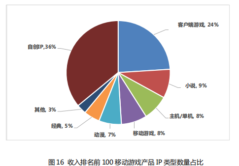 2020 年,在收入前 100 移动游戏产品 IP 类型数量占比中,数 量占比最多的是自创 IP,占比为 36%。另有 24%、9%和 8%的移动游 戏分别由客户端游戏、小说和主机/单机游戏改编而来。