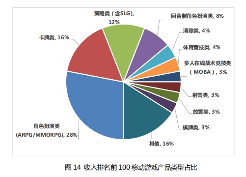 2020 年,在中国移动游戏收入排名前 100 的产品中,游戏类 型逐渐丰富,用户选择比较多,目前有三类游戏占比超过 10%,分 别是:角色扮演类游戏,占比为 28%;卡牌类游戏,占比为 16%; 策略类游戏,占比为 12%。