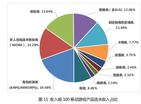 2020 年,在中国移动游戏收入排名前 100 的产品中,角色扮 演类游戏占比为 19.48%;多人在线战术竞技类游戏发展迅速,市 场扩张速度极快,占比为 15.28%;射击类游戏仅次于多人在线战 术竞技类游戏,占比为 15.04%,三者占总收入的 49.8%,占全部收入的近一半。