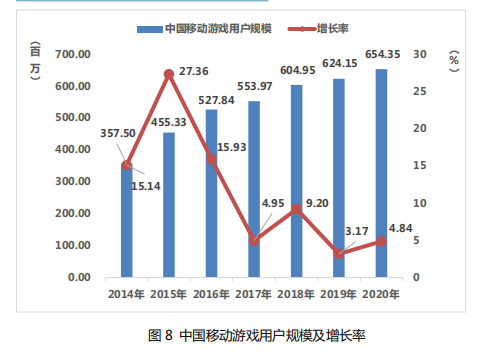 2020年,中国移动游戏用户规模达6.54亿人,同比增长4.84%。
