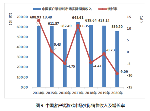2020 年,中国客户端游戏市场实际销售收入 559.2 亿元,比 2019 年减少了 55.94 亿元,同比下降 9.09%。