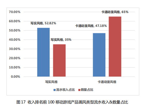 2020 年,在中国移动游戏收入排名前 100 的产品中,写实风 格的产品数量占比虽然略低,但是收入比例较高。