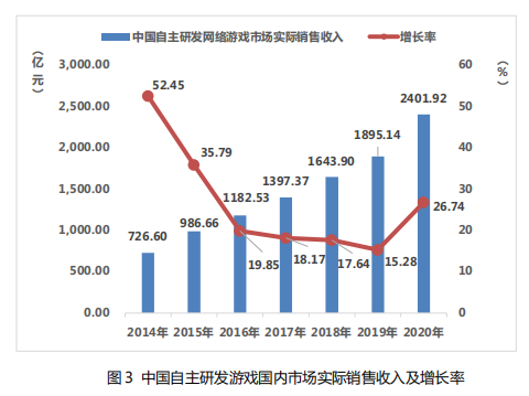 2020 年,中国自主研发游戏国内市场实际销售收入 2401.92 亿元,比 2019 年增加了 506.78 亿元,同比增长 26.74%。