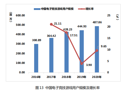 2020 年,中国电子竞技游戏用户规模达 4.88 亿人,同比增长 9.65%,用户数量保持稳定增长。