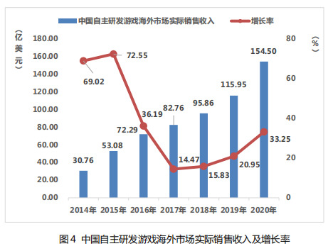 2020 年,中国自主研发游戏海外市场实际销售收入达 154.50 亿美元,比 2019 年增加了 38.55 亿美元,同比增长 33.25%,继续 保持高速增长态势。
