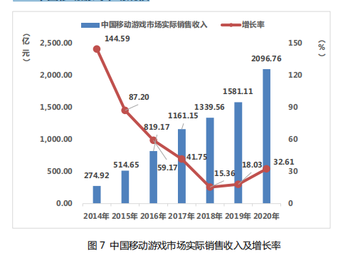 2020 年,中国移动游戏市场实际销售收入 2096.76 亿元,比 2019 年增加了 515.65 亿元,同比增长 32.61%。