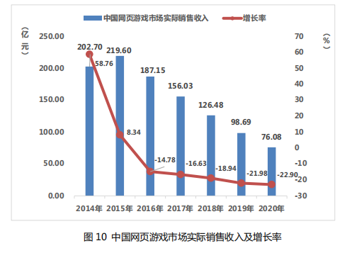 2020 年,网页游戏产品开服量减少,整体市场持续下降。中 国网页游戏市场实际销售收入仅为 76.08 亿元,比 2019 年减少了 22.61 亿元,同比下降 22.9%,同比增速呈现逐年下降的趋势。