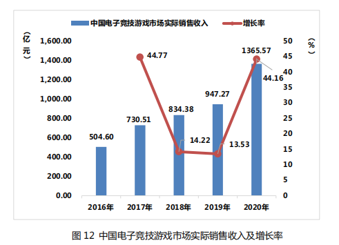 2020年,中国电子竞技游戏市场实际销售收入 1365.57亿元, 比 2019 年增加了 418.3 亿元,同比增长 44.16%。