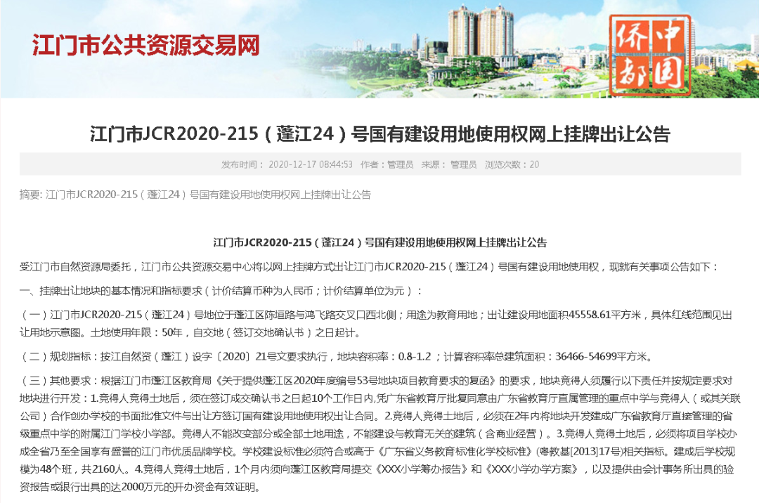 根据出让条件显示,竞得人竞得土地后,必须在 2年内 将地块开发建成广东省教育厅直接管理的 省级重点中学 的 附属江门学校小学部 。