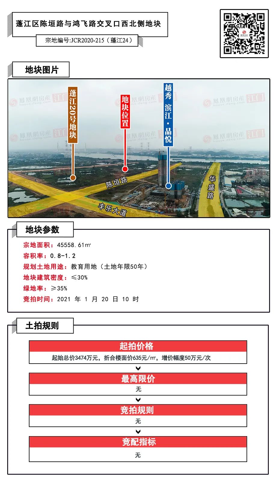 该地块位于蓬江区陈垣路与鸿飞路交叉口西北侧,出让用地面积为45558.61㎡(约68亩),容积率为0.8-1.2,最高计容面积为54699㎡。