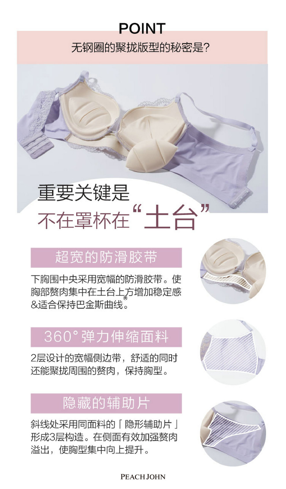 日本大型内衣和家居服潮牌PEACH JOHN蜜桃派 于今年冬季发售新品——美胸育乳调整文胸。对于如何面对胸部的变化进行护理保养,从而轻松拥有理想的胸部曲线,为此孕育而生了新品育乳调整文胸。其日常和夜间使用等等的舒适功能性自不必说,设计和穿着感也十分讲究。